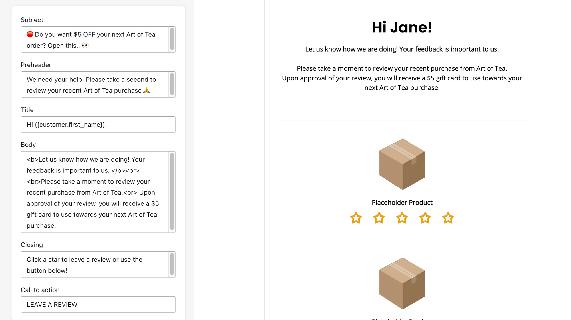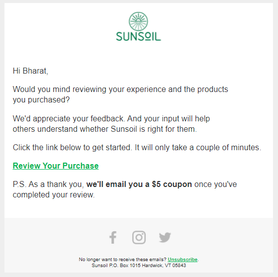 Tip: If you’re giving customers a discount, don’t keep it a secret! Make it clear in the email that customers will get a discount for leaving a review (more on this later).