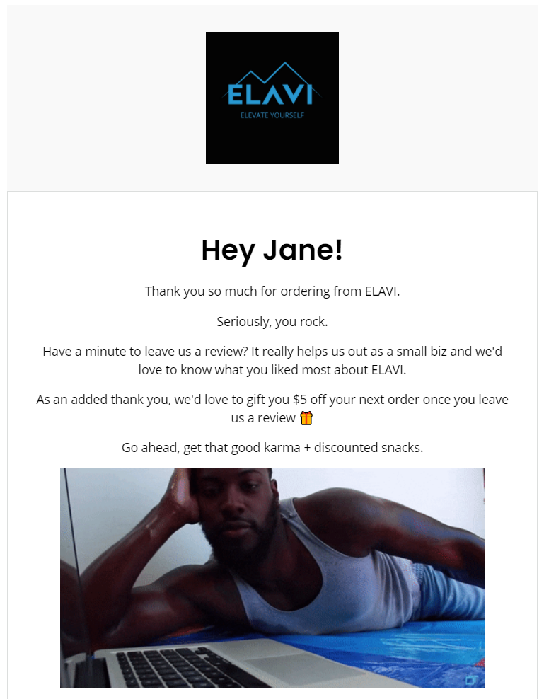 We see brands of all sizes offering a standard $5-$10 coupon on a customer’s next purchase as an incentive. ELAVI, a functional snack company, uses this strategy and has said it re-engages customers for a follow-on sale and builds their library of reviews visible on their site, which they love to see!