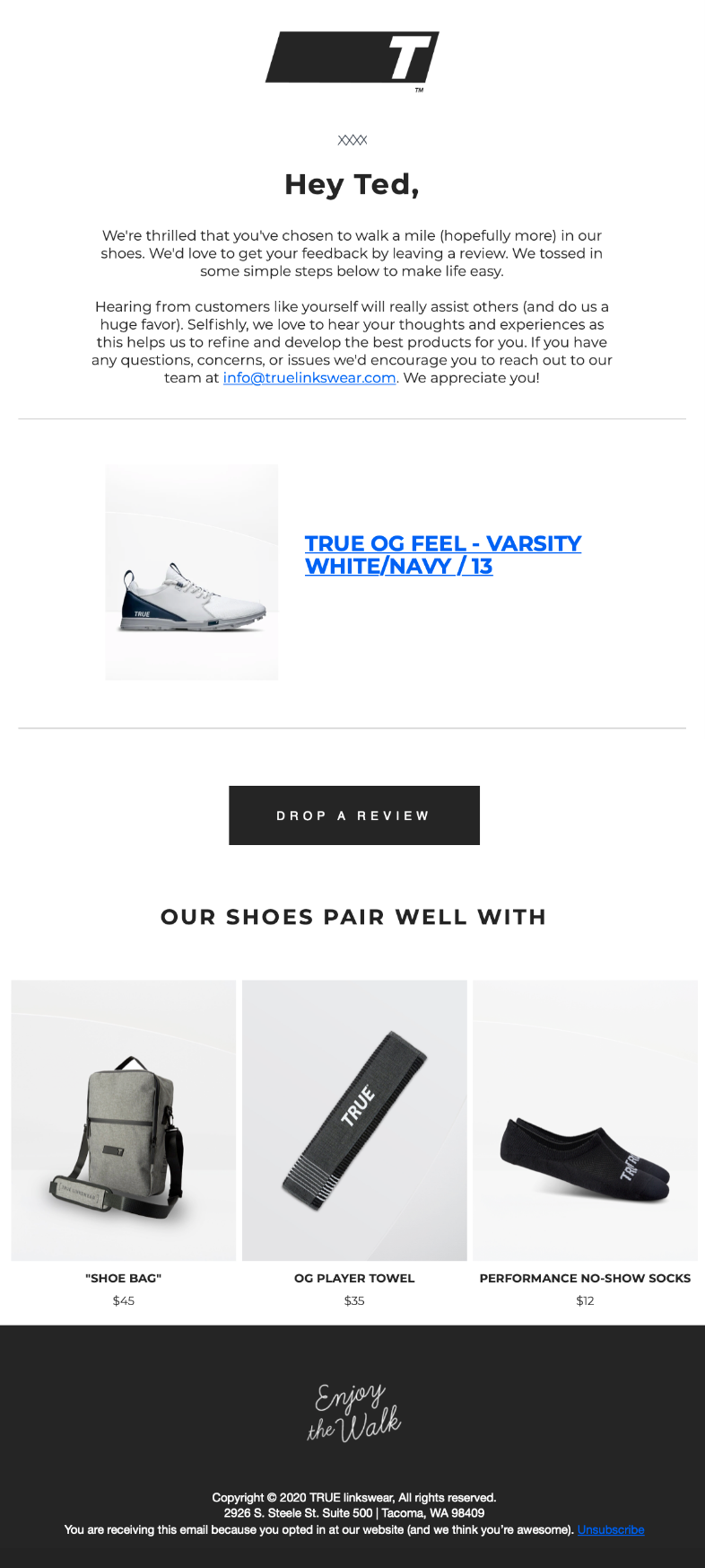 At Junip, we recommend a 7-10 day delay after an order is shipped. You should also consider other variables that impact shipping times like international orders, product returns, how soon customers use your product, how long it takes to see results, etc. TRUE Linkswear, an athletic shoe brand, waits 14 days after a customer receives their shoes so they have enough time to test them out.